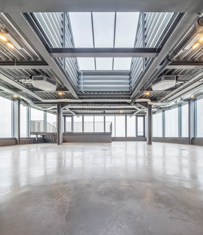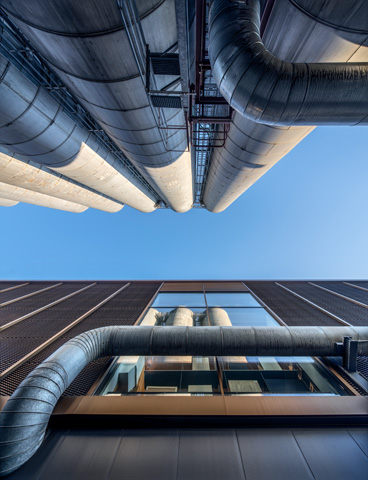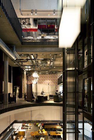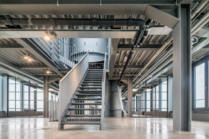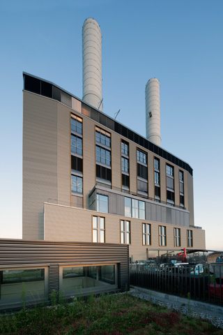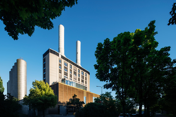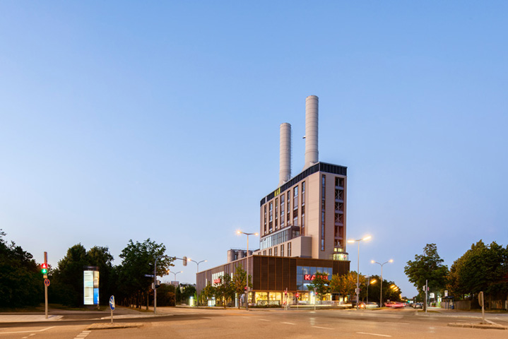 Umbau, Sanierung und Erweiterung eines ehemaligen Heizkraftwerks mit Ausstellungs- und Verkaufsflächen für "Flagship-store" Möbelhaus der KARE Design GmbH, Gastronomie und Dachterrasse, Loft-Büros und Tiefgarage, Aufstockung 11. OG